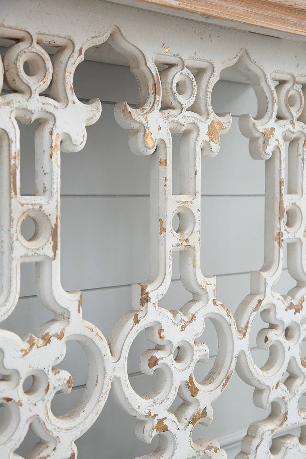 Introducing the Rustic Fir Wood Console Table, a captivating blend of vintage charm and intricate craftsmanship that enhances any entryway or living space. Crafted from sturdy fir wood, this elegant console features a weathered, distressed white frame with subtle gold accents peeking through, showcasing the natural texture and imperfections of the wood. The tabletop, finished in a warm, natural wood tone, provides a perfect surface for displaying books or a vase of vibrant hydrangeas, as seen against the soft blue wall and decorative backdrop. The ornate, openwork base, with its elaborate scrollwork and arched supports, adds a touch of old-world sophistication, complemented by the cozy jute rug below. The Rustic Fir Wood Console Table brings a harmonious mix of rustic beauty and refined elegance, creating a striking focal point for your home!
