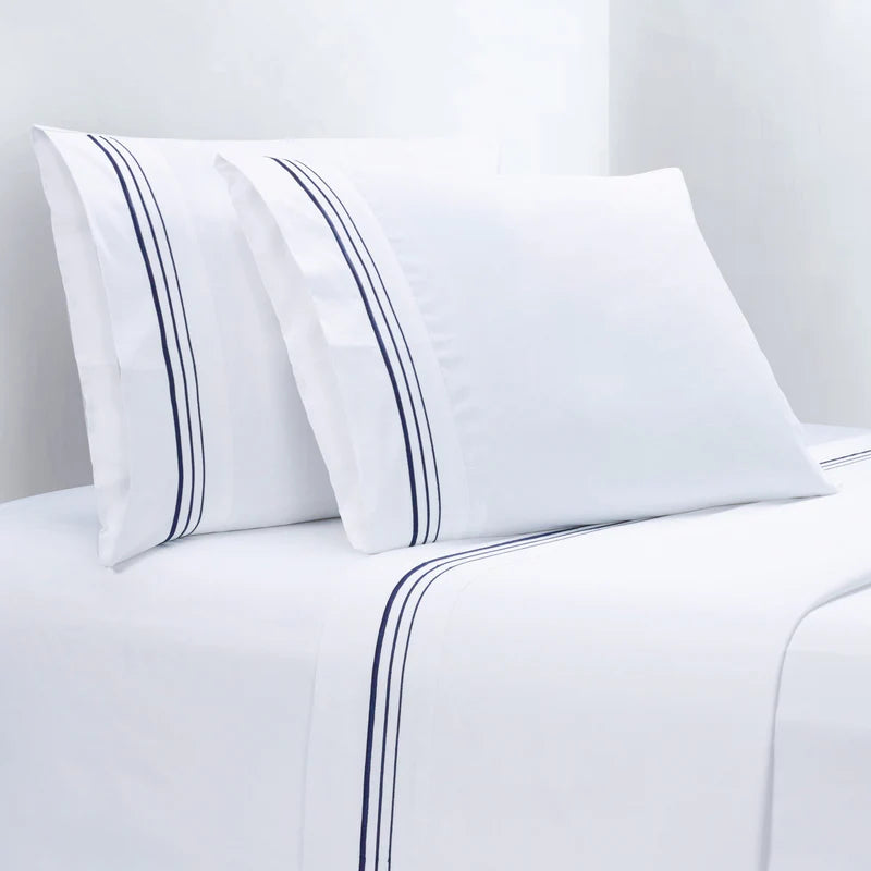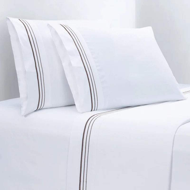 Recall the luxurious look and feel of grand hotel bedding with our Embroidered Border Sheet Set. The pure white 350TC sateen sheeting provides an elegant drape, with crisp embroidered line accents for added texture and a refined finish. Coordinate with shams, duvet covers, and bed skirts in our Border Embroidery Collection for a timeless yet modern bedroom look.