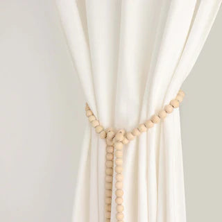 Designed with farmhouse country decor in mind, our Cream Rustic Boho Chic Wood Bead Garland With Tassels features earthy tones and a rustic charm. It is crafted from 100% natural wood, giving it a beautiful and unique wood grain finish. Hang it on walls, doors, or even use it as prayer beads to infuse your home or event space with a touch of nature. Each garland is handmade with care, and the tassels on each end add a beautiful finishing touch that enhances its rustic appeal.