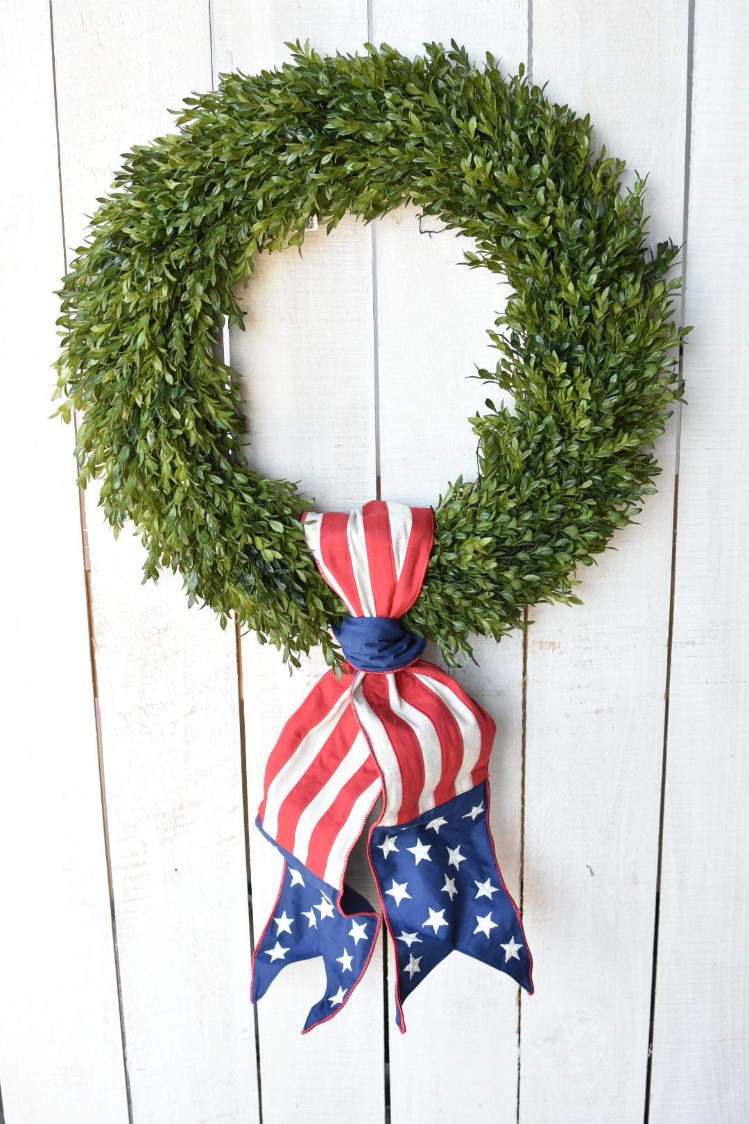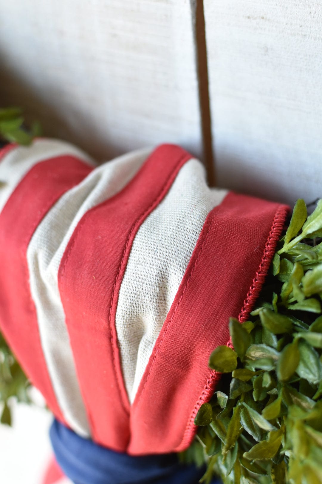 Celebrate Memorial Day and the Fourth in style with this eye-catching canvas 70" Stars and Stripes Banner! Crafted with patriotic passion, this banner boasts vibrant red stripes that are appliqued on a tan linen body, finished off with blue ends and detailed with white embroidered stars. Contrasting the striped front is a solid blue cotton backside that you can use to accent as you wish! And you can shape it as you wish with the heavy-duty wire that runs the entire lengths to shape the dovetail ends, creating the perfect addition to a greenery wreath or charming front door. Get ready to add some American spirit to your home! (wreath not included)