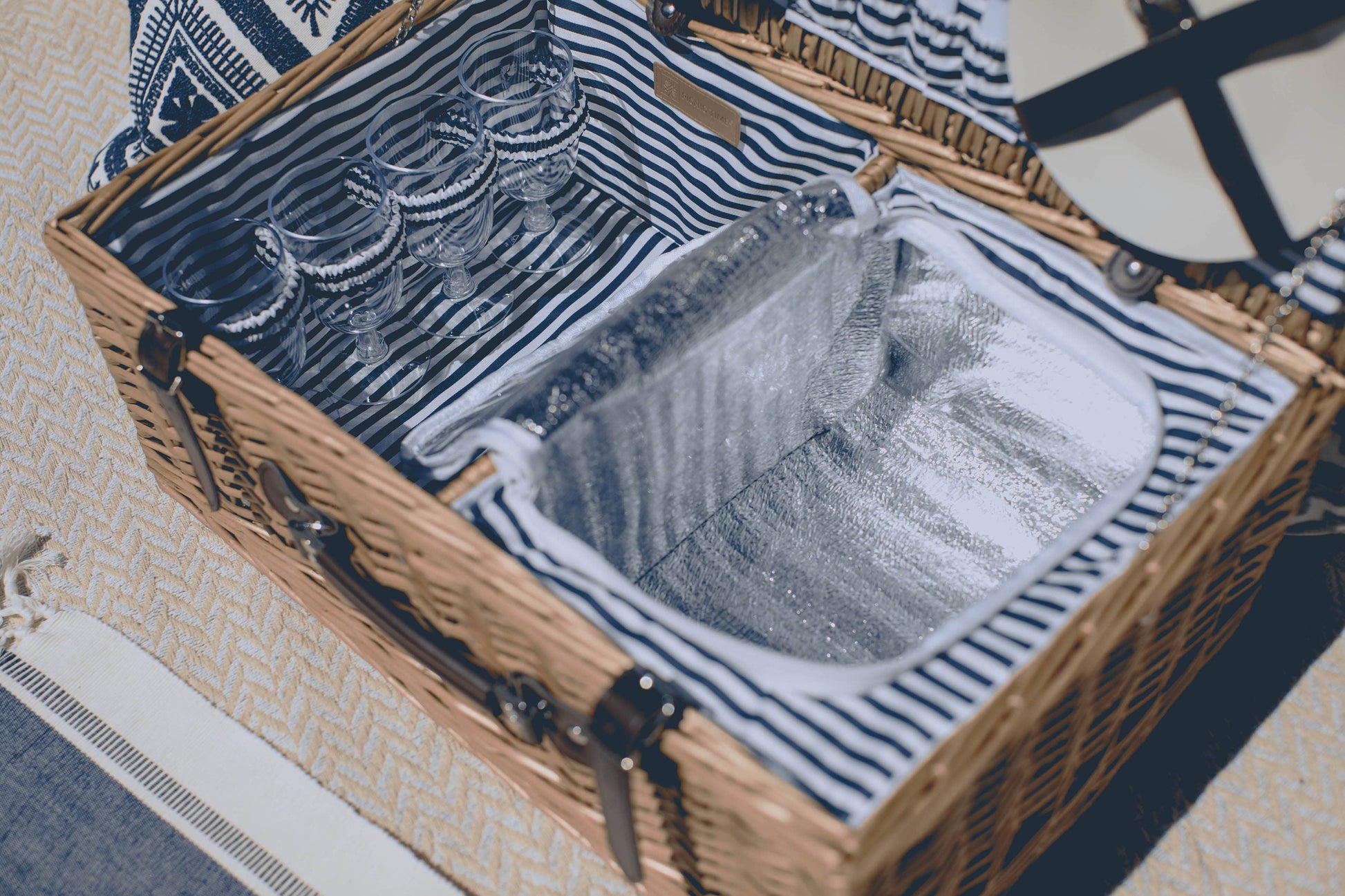 The Belmont Picnic Basket for 4 is a deluxe English picnic basket set loaded with full wine and cheese service for four and plenty of romantic vintage charm. Our willow wicker picnic basket features a durable lining, removable cooler section, plus a wine picnic set with four 100% cotton napkins, alongside plates and silverware for 4 securely attached to the lid with leather straps and 4 wine glasses held in place in the body of the basket with elastic. And there’s still plenty of room for hot and cold foods, wine, cheese, charcuterie and more! With all of the necessary accessories for a perfect picnic, the Belmont picnic basket set is a classy and convenient wedding or anniversary gift for loving couples and families!