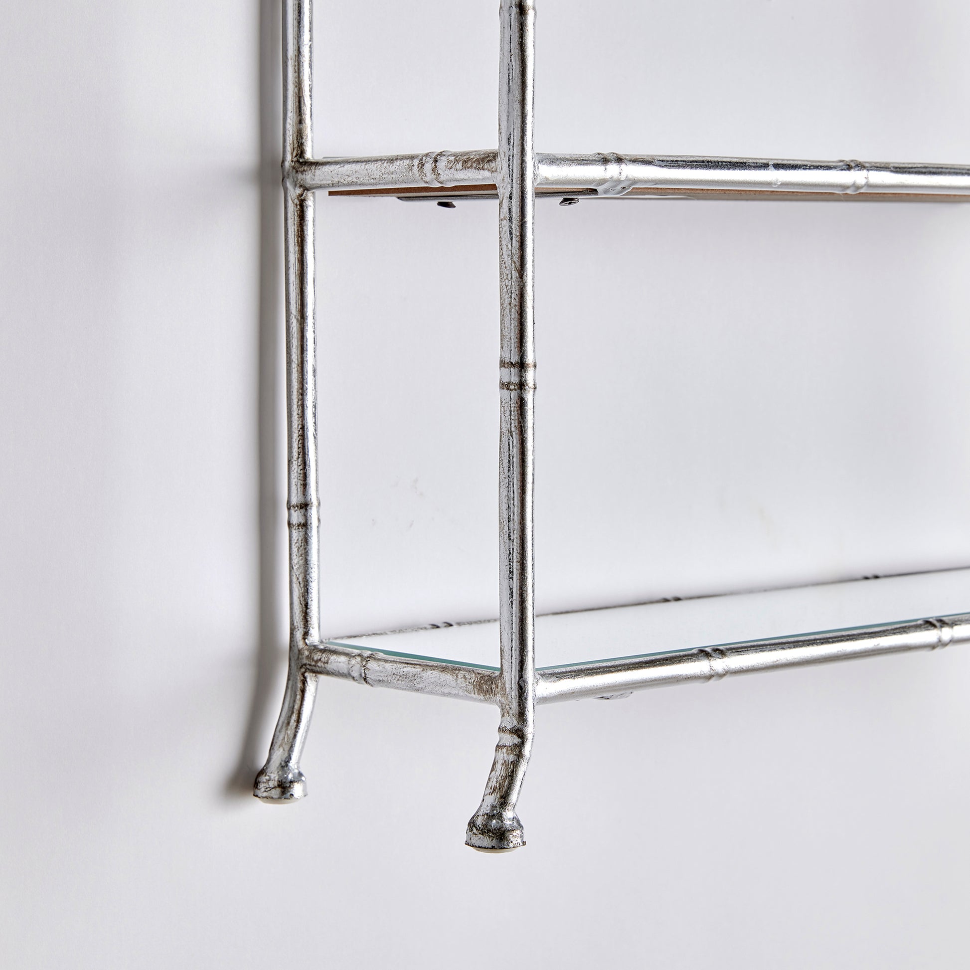 This curio shelf is a contemporary take on chinoiserie style. Smooth and refined, it is scaled to work well in the smaller space. The silver finish and mirrored accents add a sense of light and reflection.