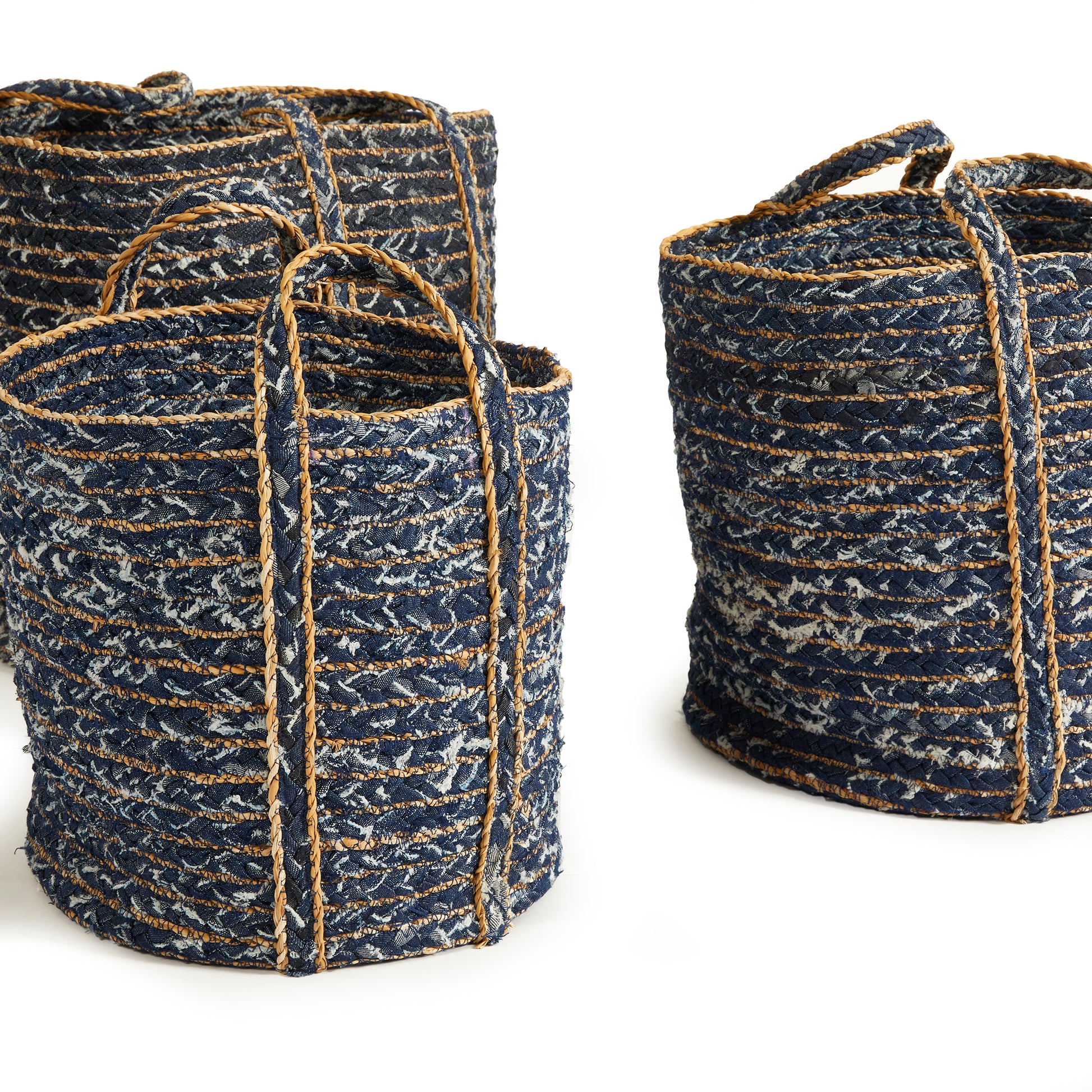 Made from recycled denim in the deepest of blue hues, this set of oval baskets don't just add storage, they also add a pop of color and rich texture to any space. Soft to the touch, they are great for towels, toys or anything needing to be tucked away.