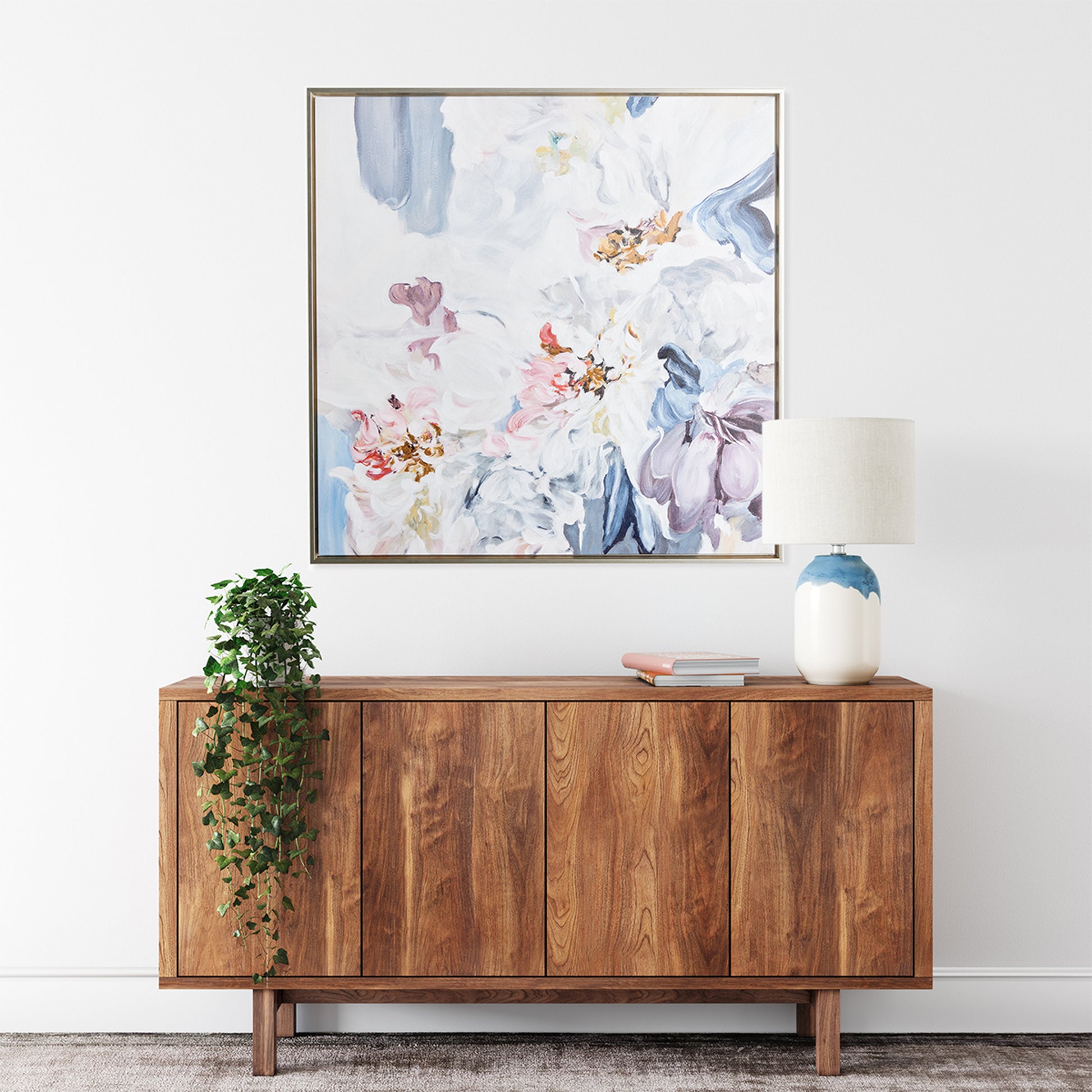 This modern interpretation of a close-up study of a lush and full floral arrangement makes for a striking accent for the wall. Highlights are hand-embellished with touches of paint creating a rich texture and depth. The canvas is finished off beautifully with a sleek silver frame.