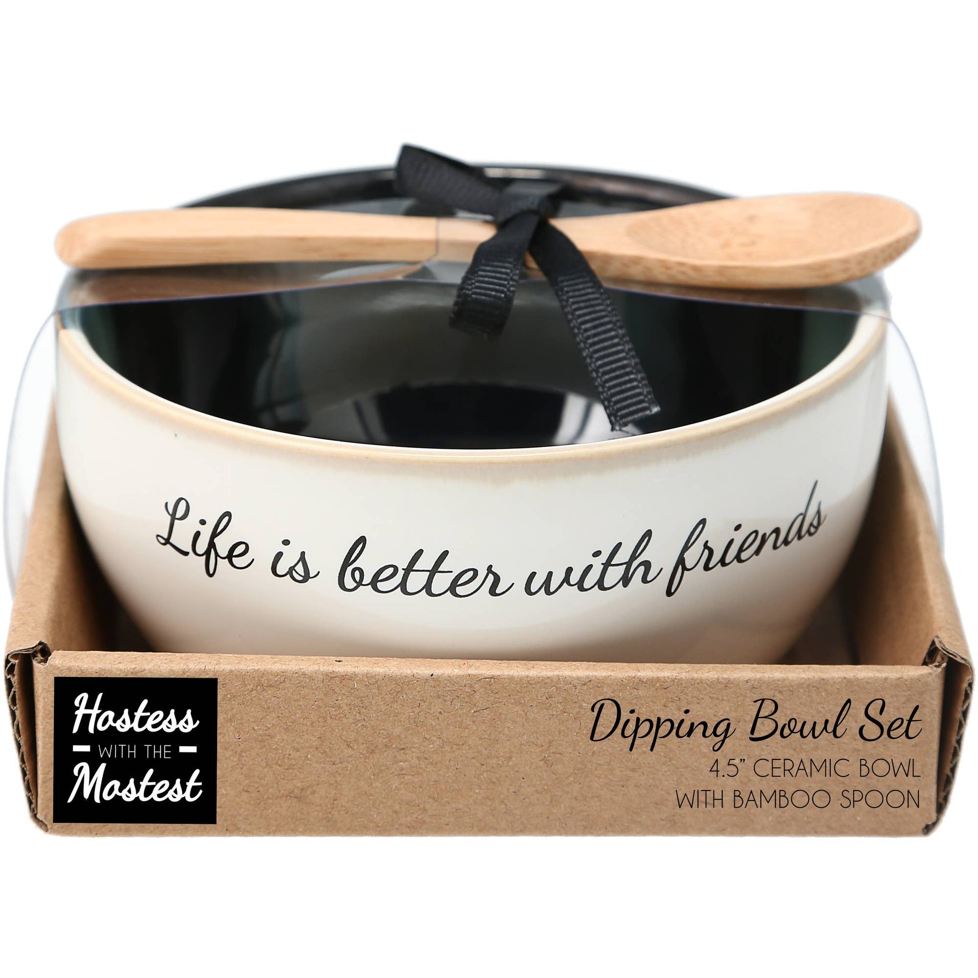 The 4.5" round & 2" tall serving bowl organic-shaped ceramic vessel and bamboo wood serving spoon will fit into modern neutral-styled homes. Prop 65 approved - excellent for hosting in the house and supplying guacamole, hummus, bean, artichoke, spinach, cheesy or french onion dips, among many others. You will see cursive written "Life Is Better With Friends" wrapping around the exterior brim of the mortar. The white, reactive blue, and navy blue glossy glazes fuse, making each bowl unique. The small light wood spoon fits comfortably into anyone's hand. Dishwasher & microwave-safe dish. Hand wash only & dry immediately; spoon - to properly season, slightly warm a food-grade mineral oil, then dab the oil on a clean, dry cloth. Apply the oiled material to the scooper in the direction of the grain. They are packaged with a black grosgrain ribbon securing the spoon to the acetate band and a cardboard base that holds the bowl securely in a die-cut box for safe shipping.