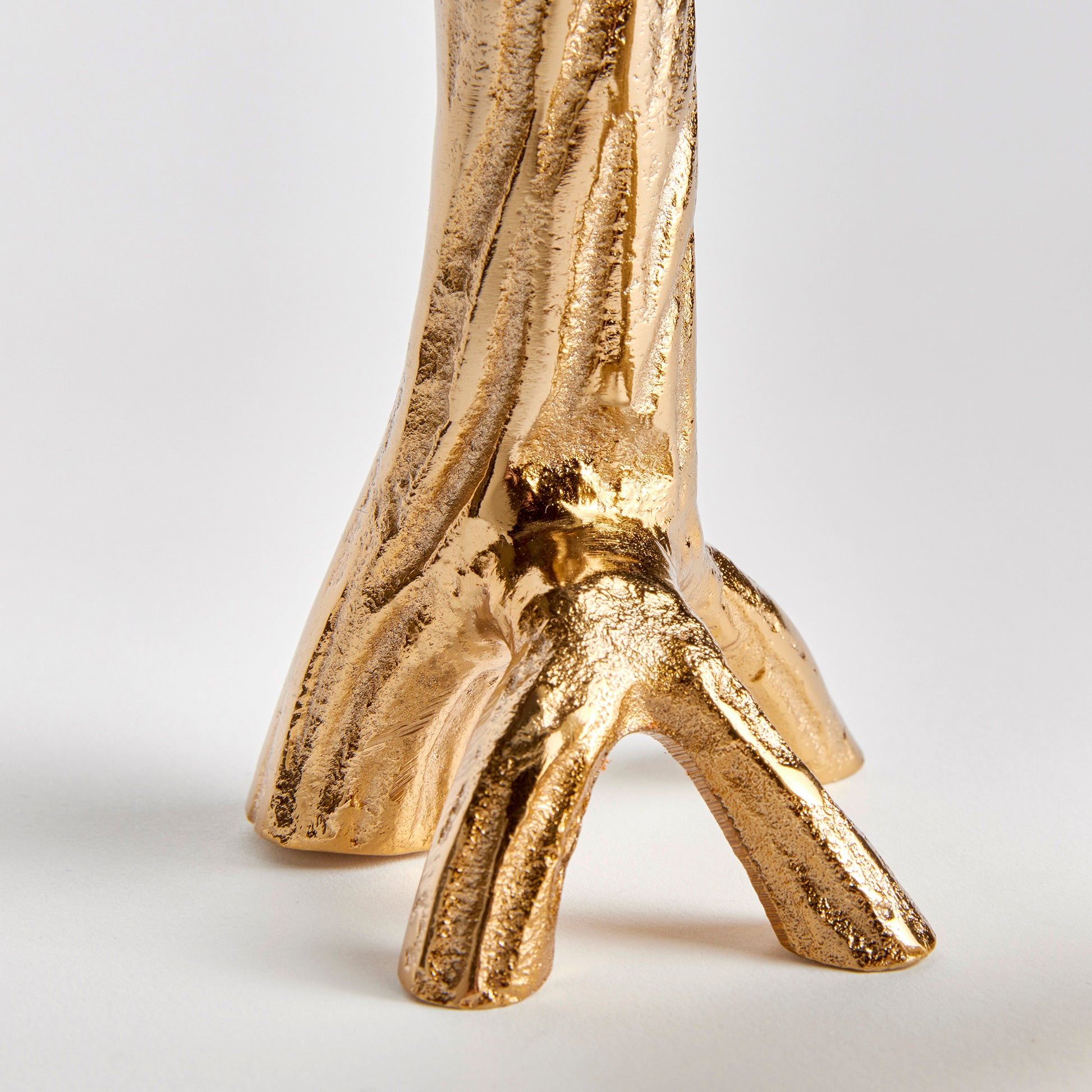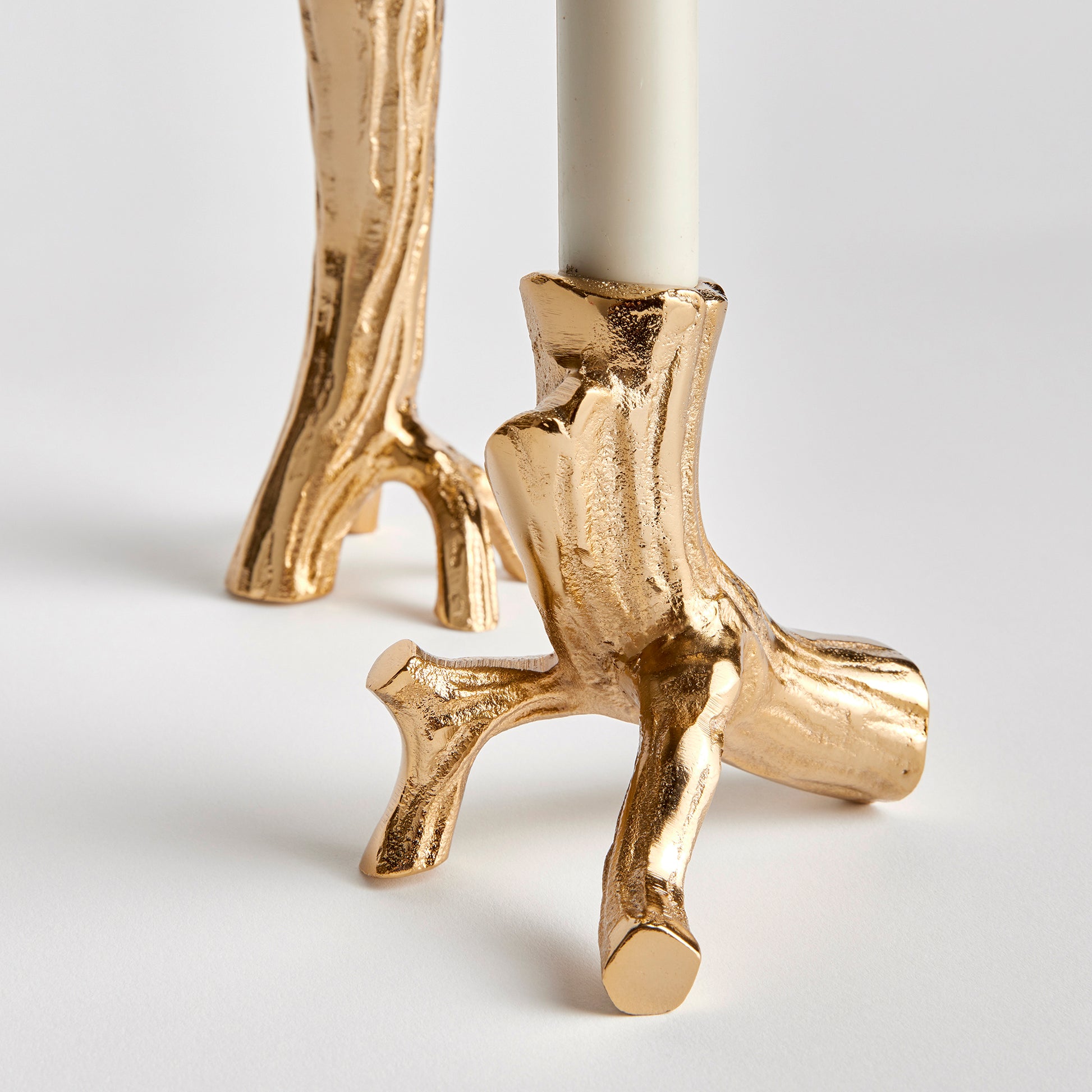 Made from hand-sculpted molds and in solid cast aluminum, these taper holders in warm gold are a substantial accent. Pair with any style taper candle and watch them glow.