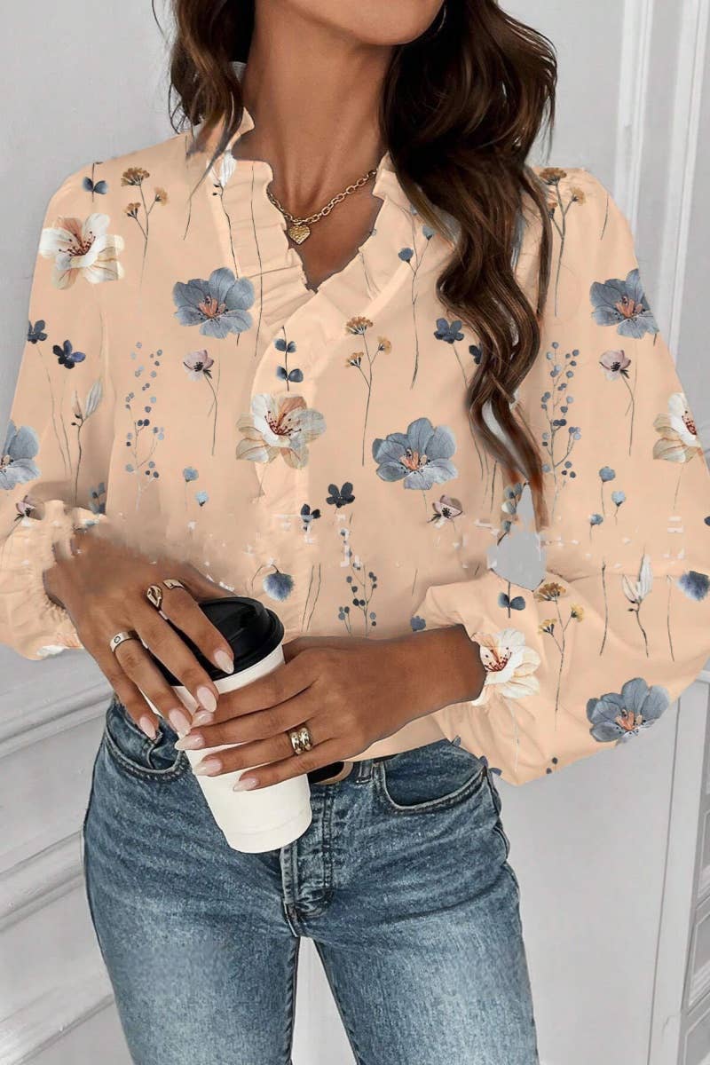 LONG-SLEEVED RUFFLED V-NECK PRINTED COMMUTER TOP 97% POLYESTER, 3% SPANDEX