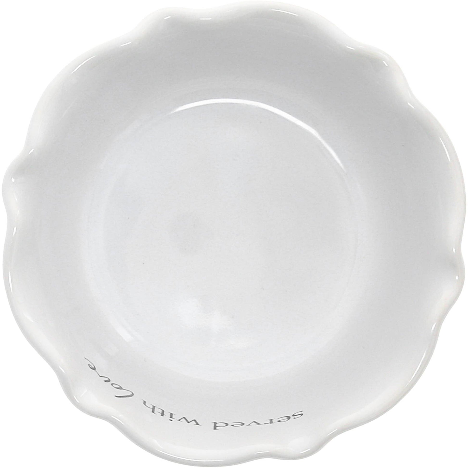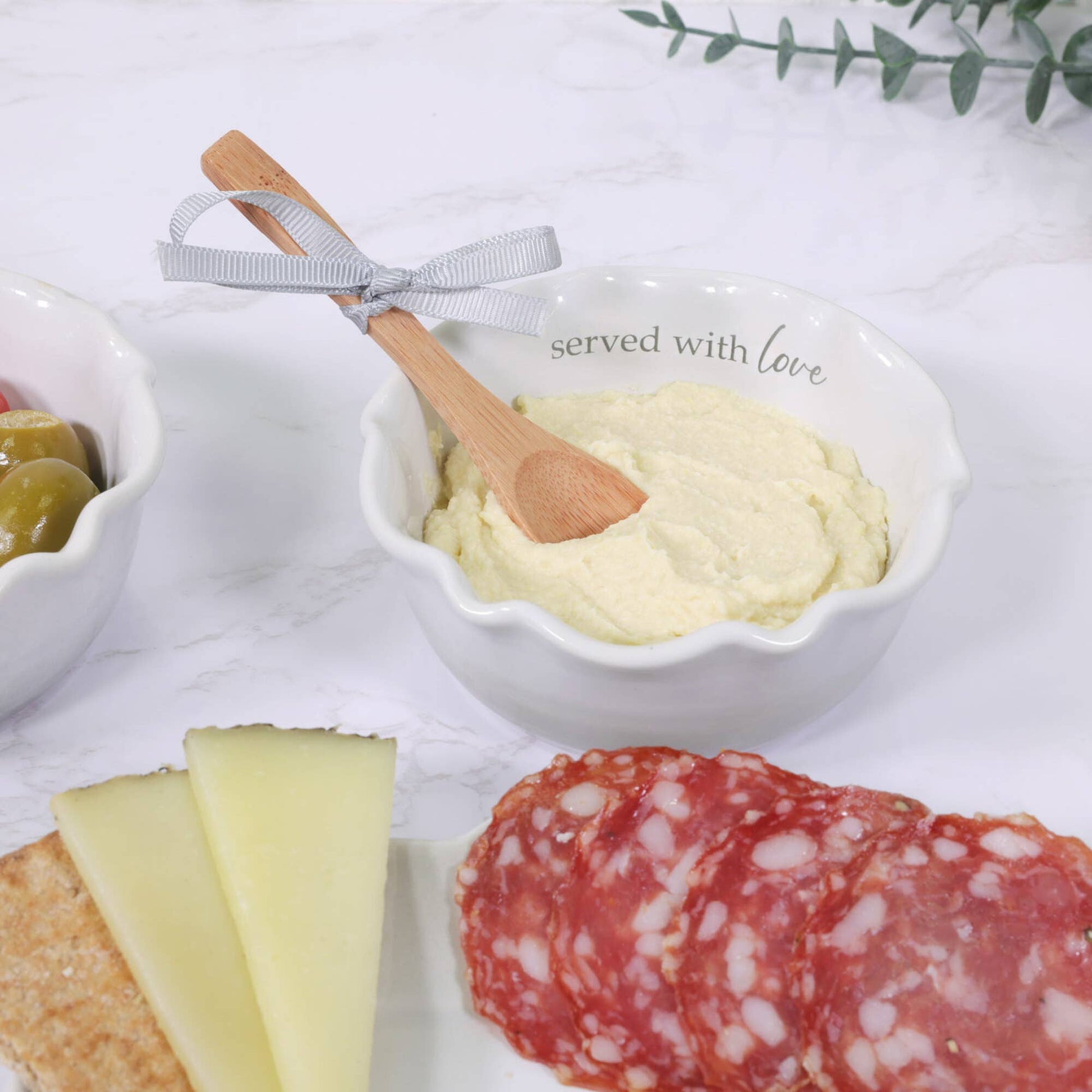4.5" round & 2" tall serving bowl organic-shaped ribbed stoneware vessel and bamboo wood serving spoon will fit into modern neutral-styled homes. Prop 65 approved - excellent for hosting in the house and supplying guacamole, hummus, bean, artichoke, spinach, cheesy or french onion dips, among many others. You will see cursive written "Served with Love" wrapping around the interior brim of the mortar. The ribbed exterior has a simplistic ombre white & tan pattern. The small light wood spoon fits comfortably into anyone's hand. Dishwasher & microwave safe dish. Hand wash only & dry immediately; spoon - to properly season, slightly warm a food-grade mineral oil, then dab the oil on a clean, dry cloth. Apply the oiled material to the scooper in the direction of the grain. They are packaged with a soft-colored gray grosgrain ribbon securing the spoon to the acetate band and a cardboard sleeve that holds the bowl. Securely in a die-cut box for safe shipping.