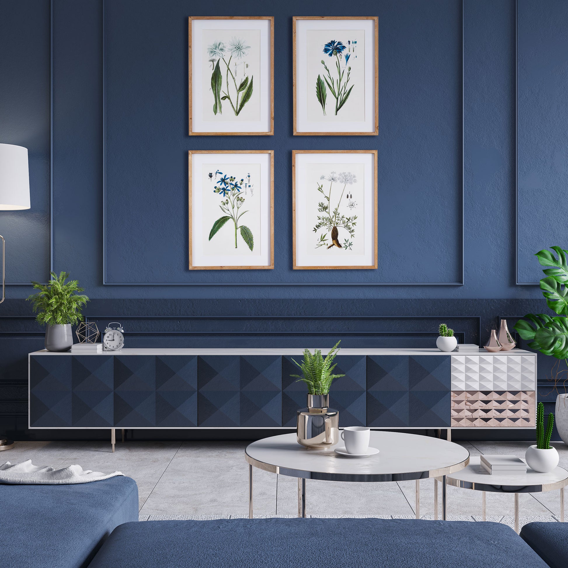 A vibrant rendition of blue and white mountain botanicals, this set of prints adds rich color and contrast. A traditional look for kitchen, foyer or bedroom.
