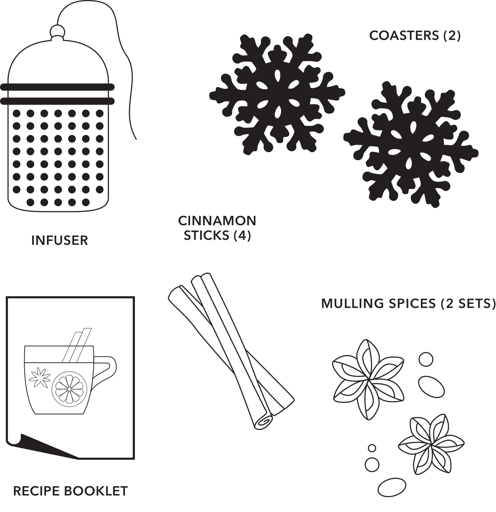 Wrapped up in plaid perfection, the kit's 10 essentials include: 2 large brews of mulling spices, 4 cinnamon sticks, stainless steel spice infuser, 2 red felt snowflake coasters, and a recipe card for mulled wine or cider.