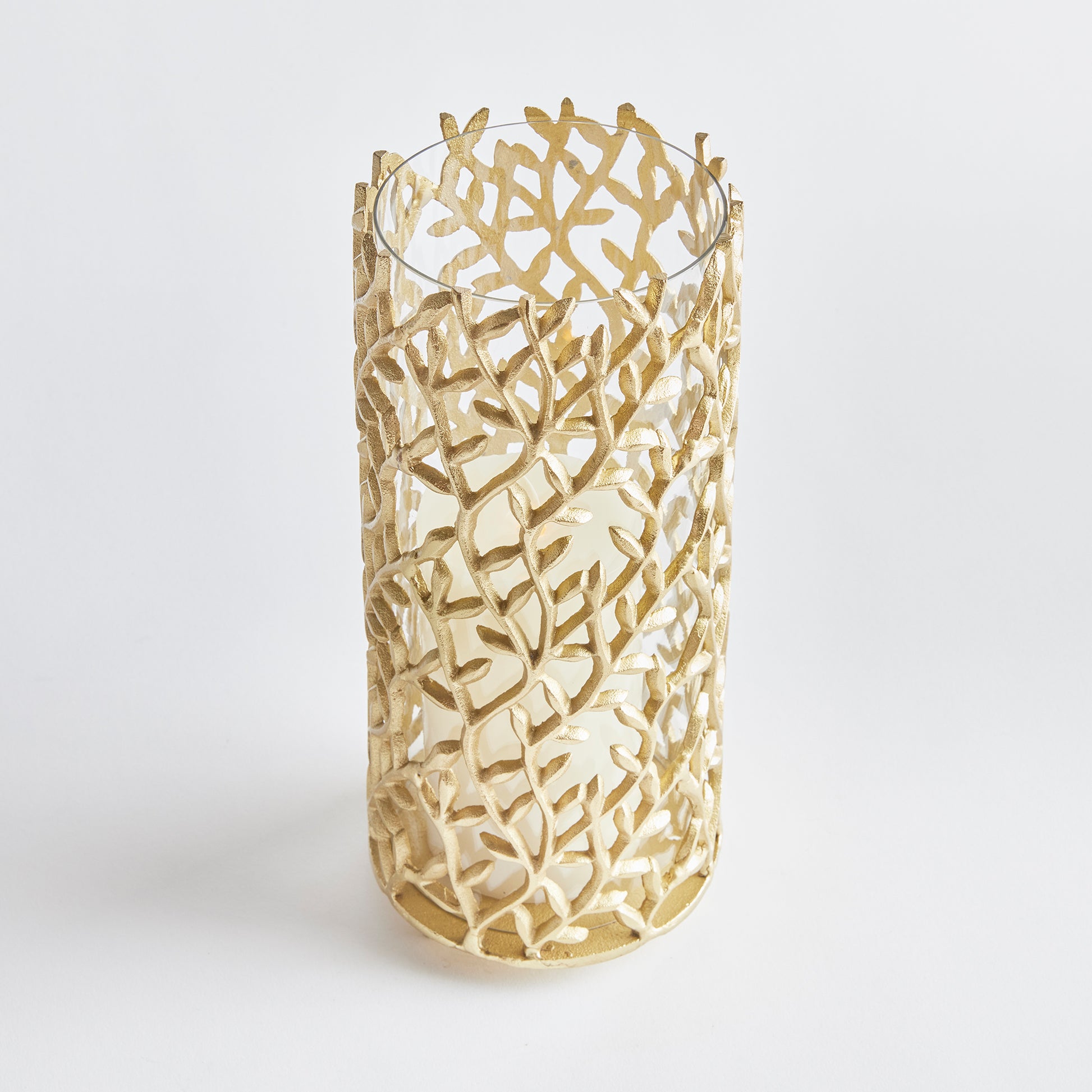 Whimsical, flowing vines make up the composition of this stunning hurricane. Complete with a glass vessel to reflect the candles glow. A beautiful way to bring a little artistry to the table.