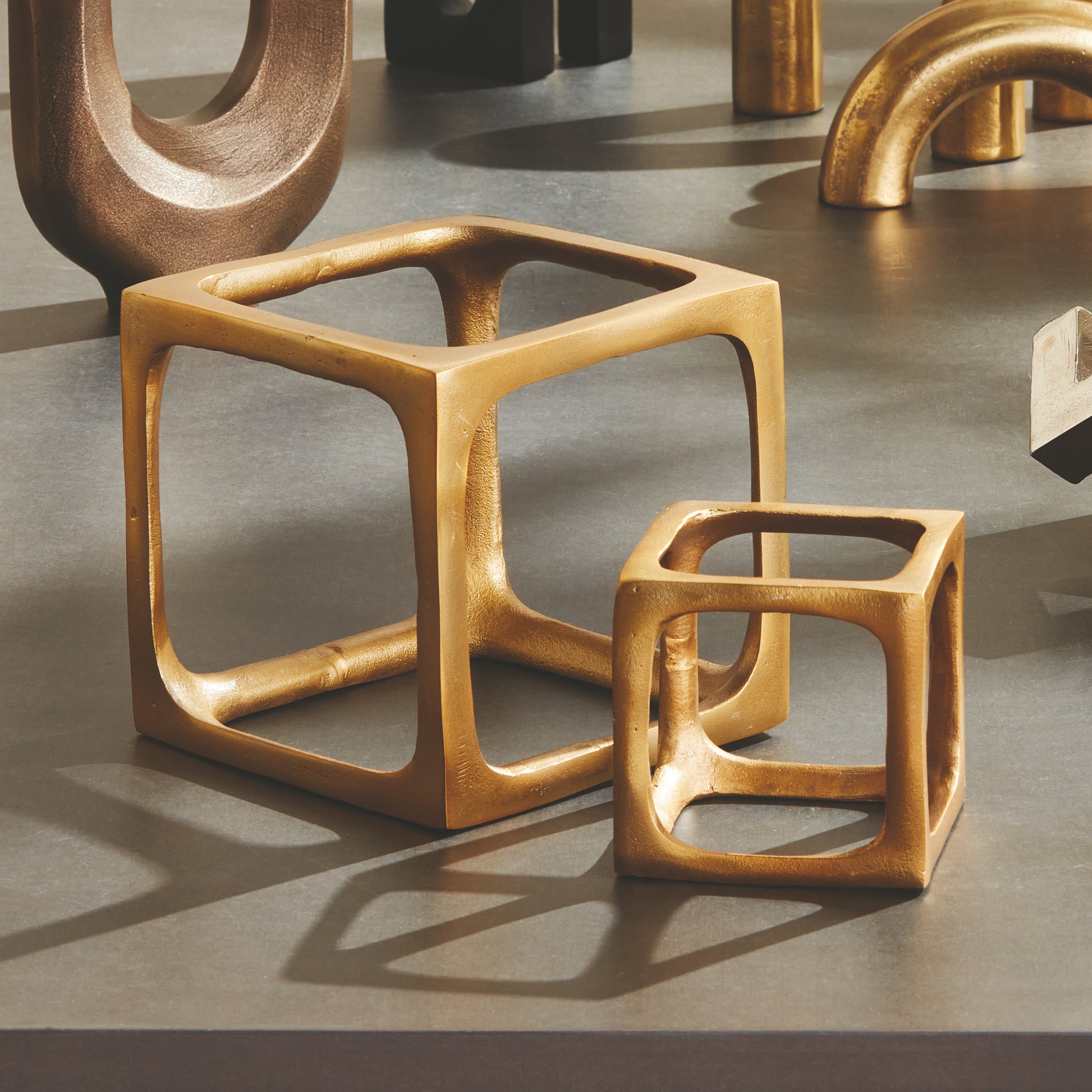 What is better than a simple three-dimensional cast aluminum rendition of a square? A set of two. These cubist sculptures in gold are a fun, modern accent for bookshelf, coffee table or desk.
