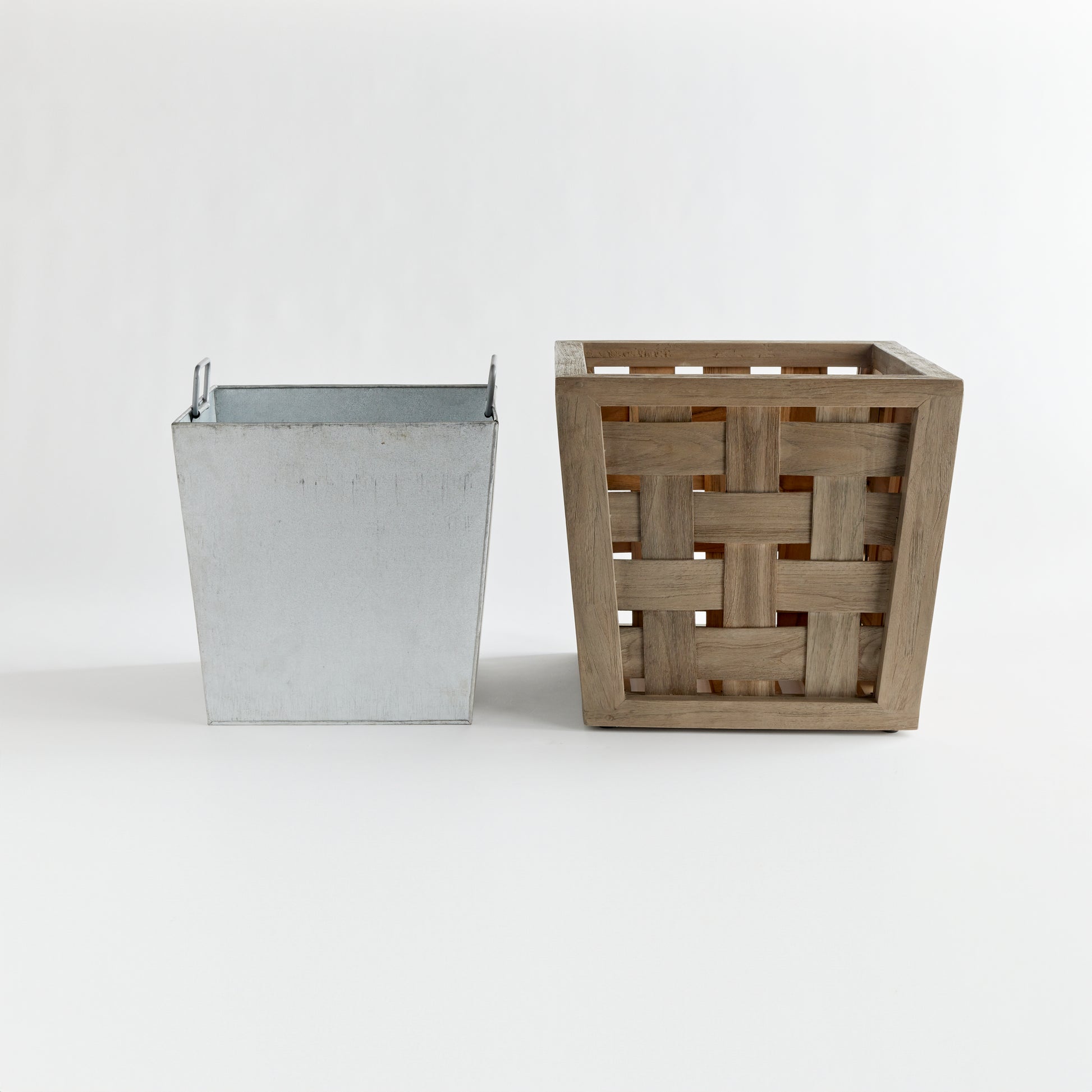Expertly handwoven using wide gray washed teak wood panels in a checked pattern. An exclusive design you won't see anywhere else, this showstopping planter has a galvanized steel liner with folding handles, drainage hole and is designed with a raised bottom. Smart as well as beautiful!
