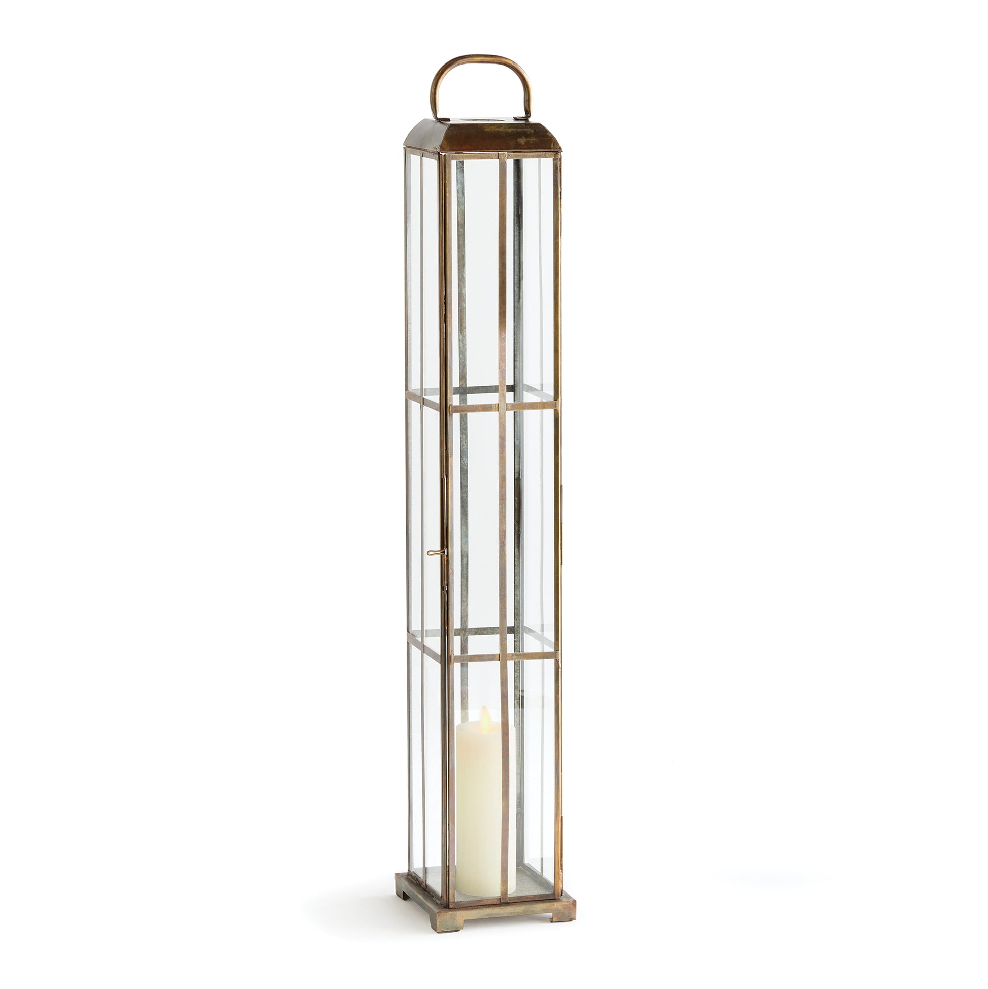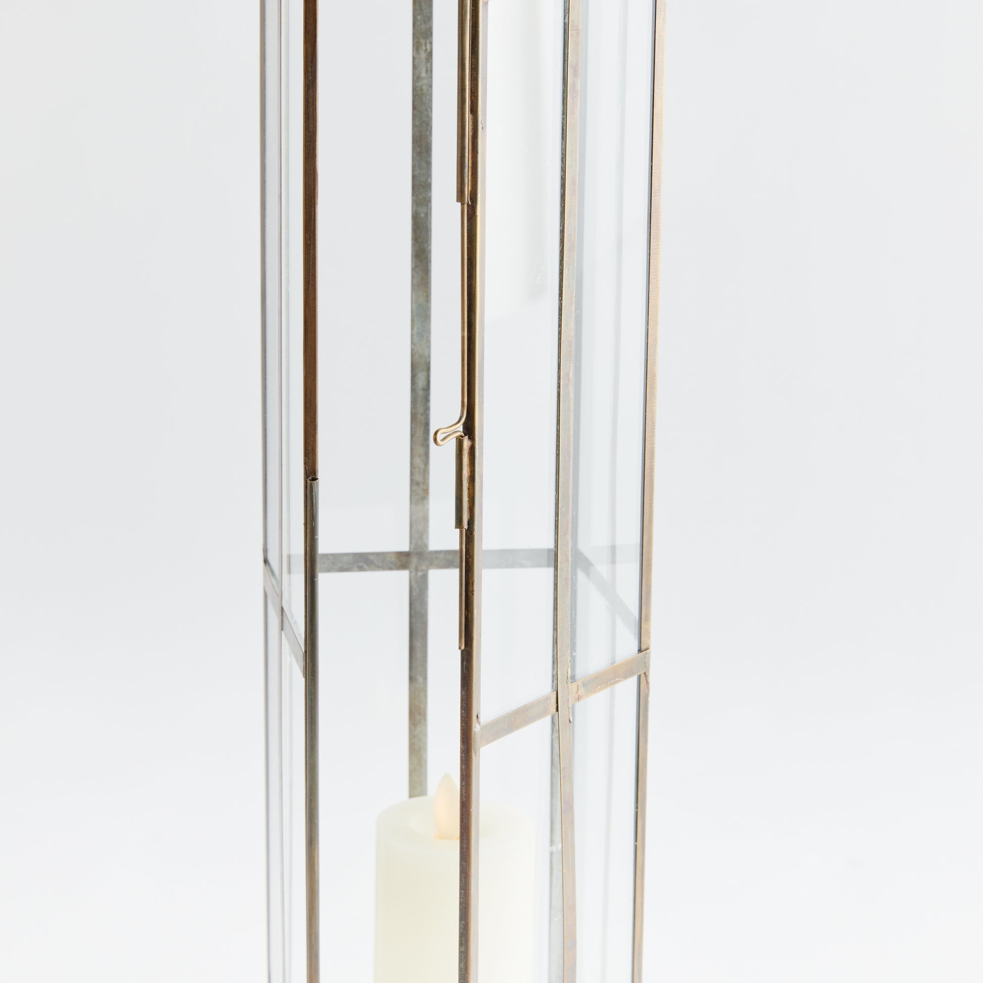 In a narrow, exaggerated shape and repeating brass pane design, this lantern has a mod feel. Scaled to add height, even when on the floor. The candlelight plays off the warm brass creating a magical ambiance.