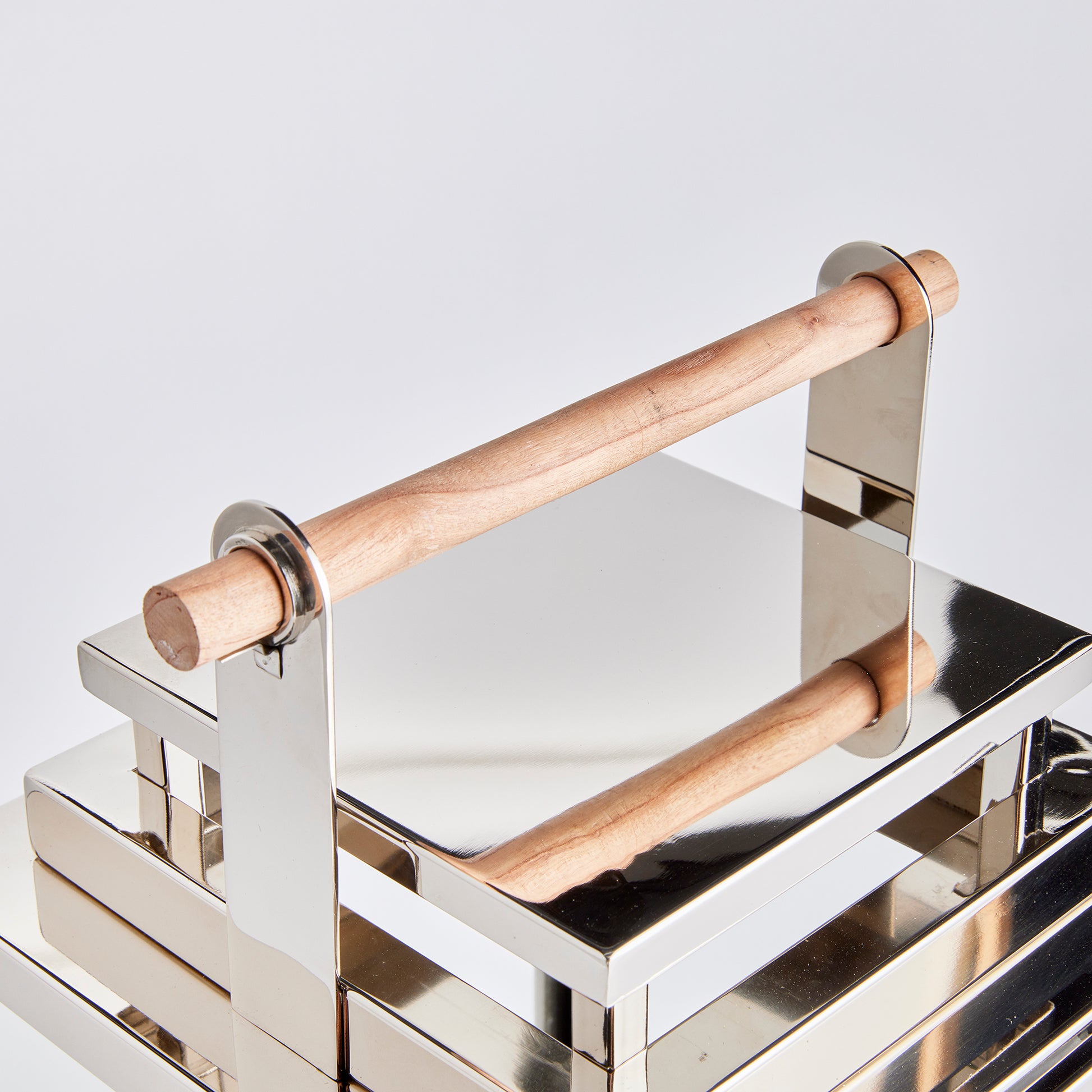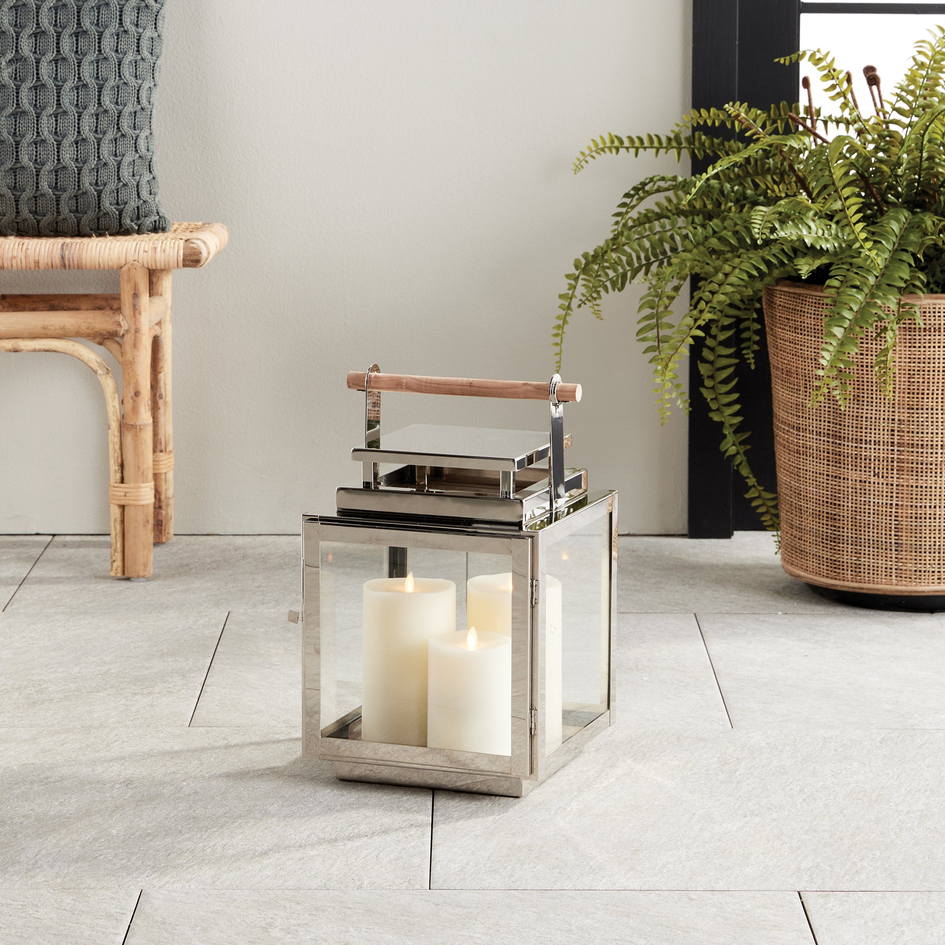 With a teak handle, wide glass panes and tailored square profile, this outdoor lantern is a handsome look for patio, porch or lanai. An exclusive chrome design you won't see anywhere else.