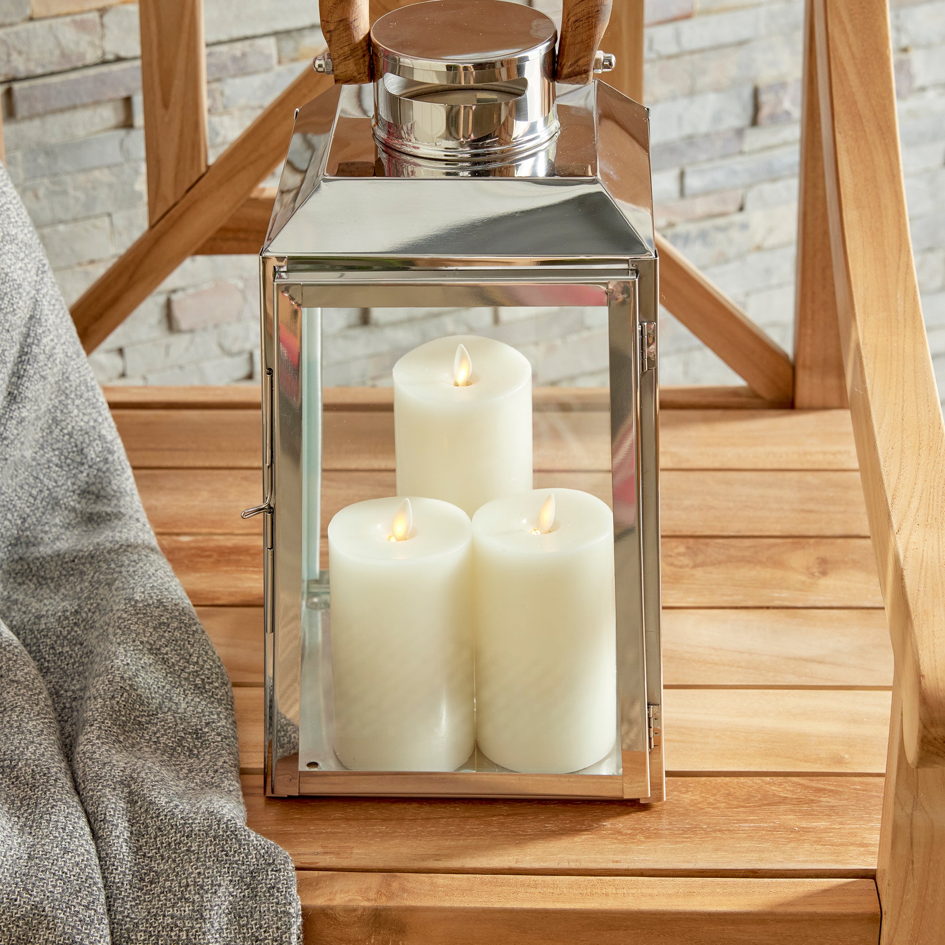 Nautical in style, this handsome outdoor lantern shines brilliantly in a chrome finish and real teak wood handle. Add a couple of pillar candles and it makes a beautiful accent for the front stoop.