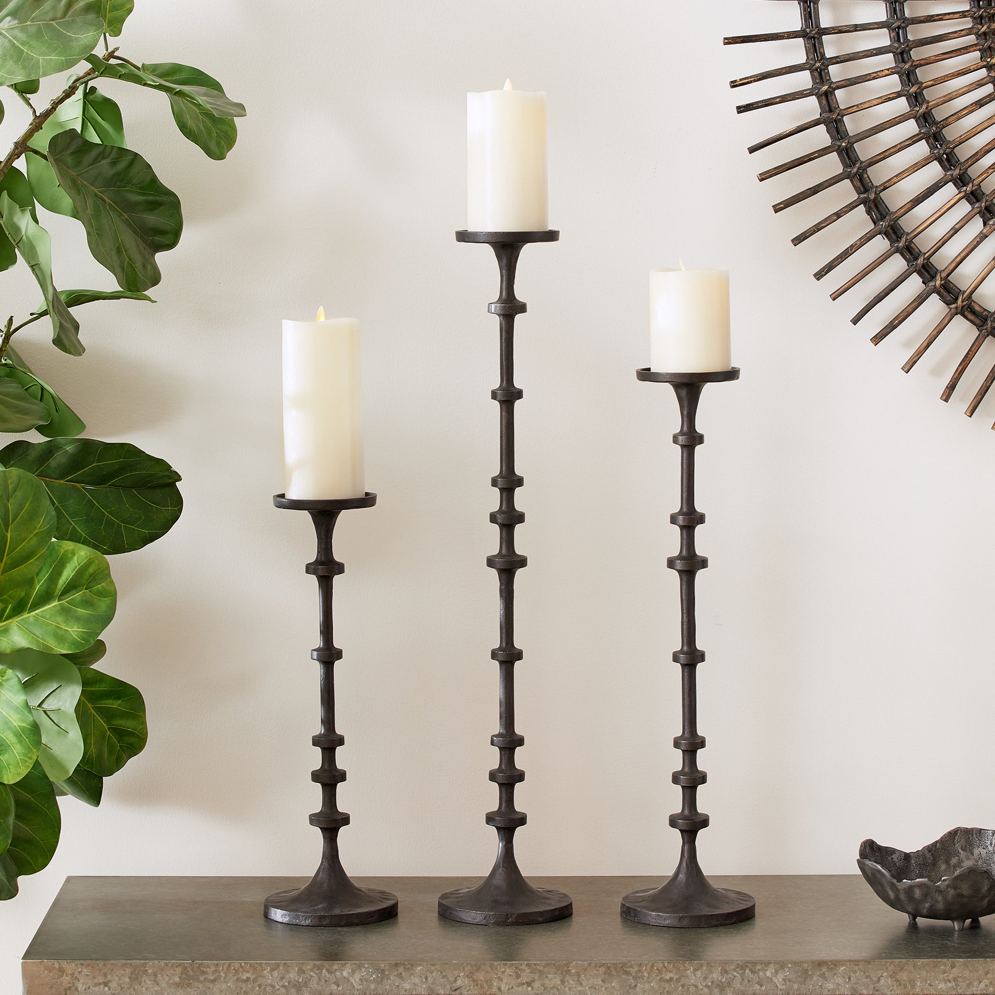 Elevate your home decor with these grand candleholders, perfect for displaying on a mantle or in a grand front entryway. A subtle nod to the ancient art of counting, the intricate notches on the base bring a contemporary flair to the design.