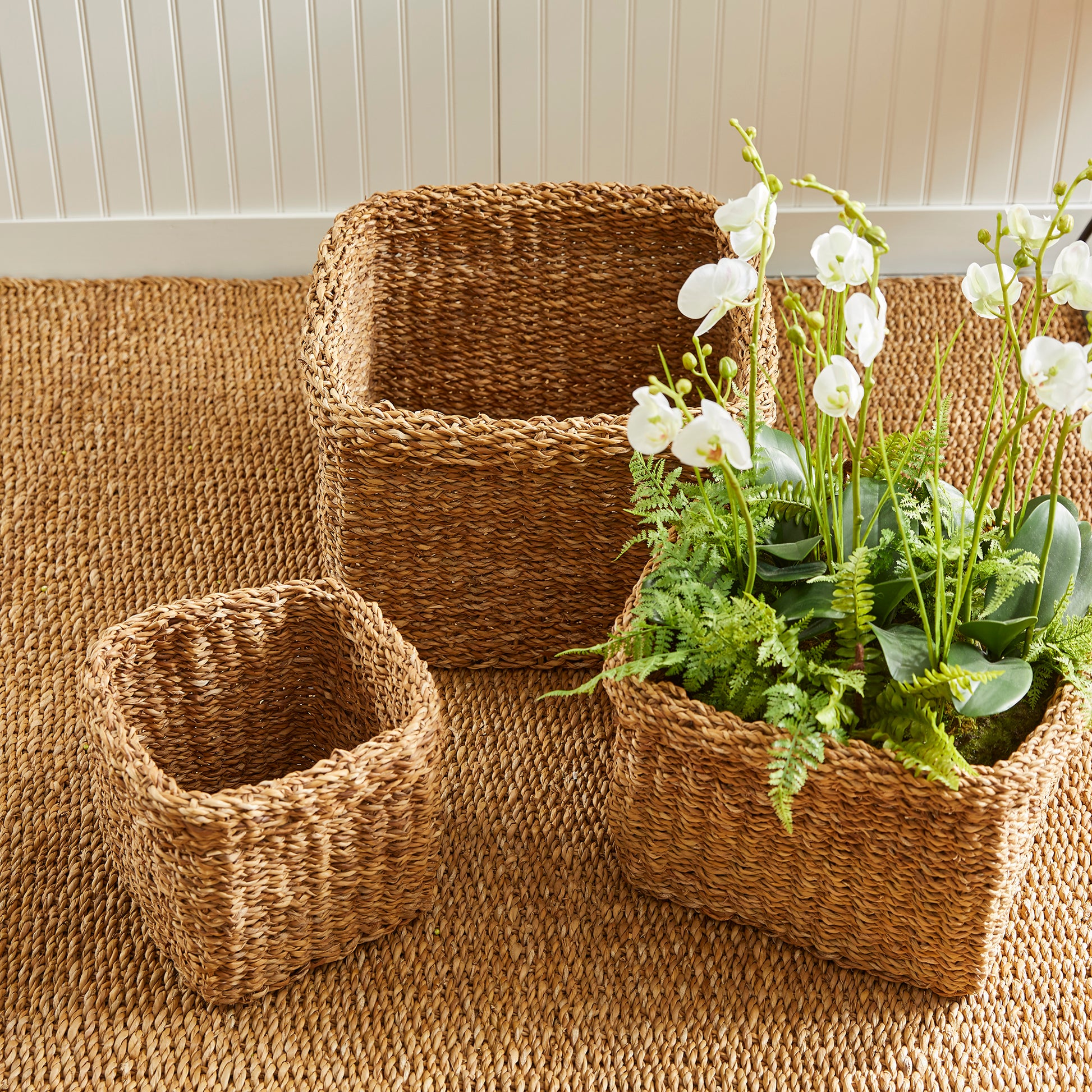 SEAGRASS SQUARE BASKETS WITH CUFFS, SET OF 3