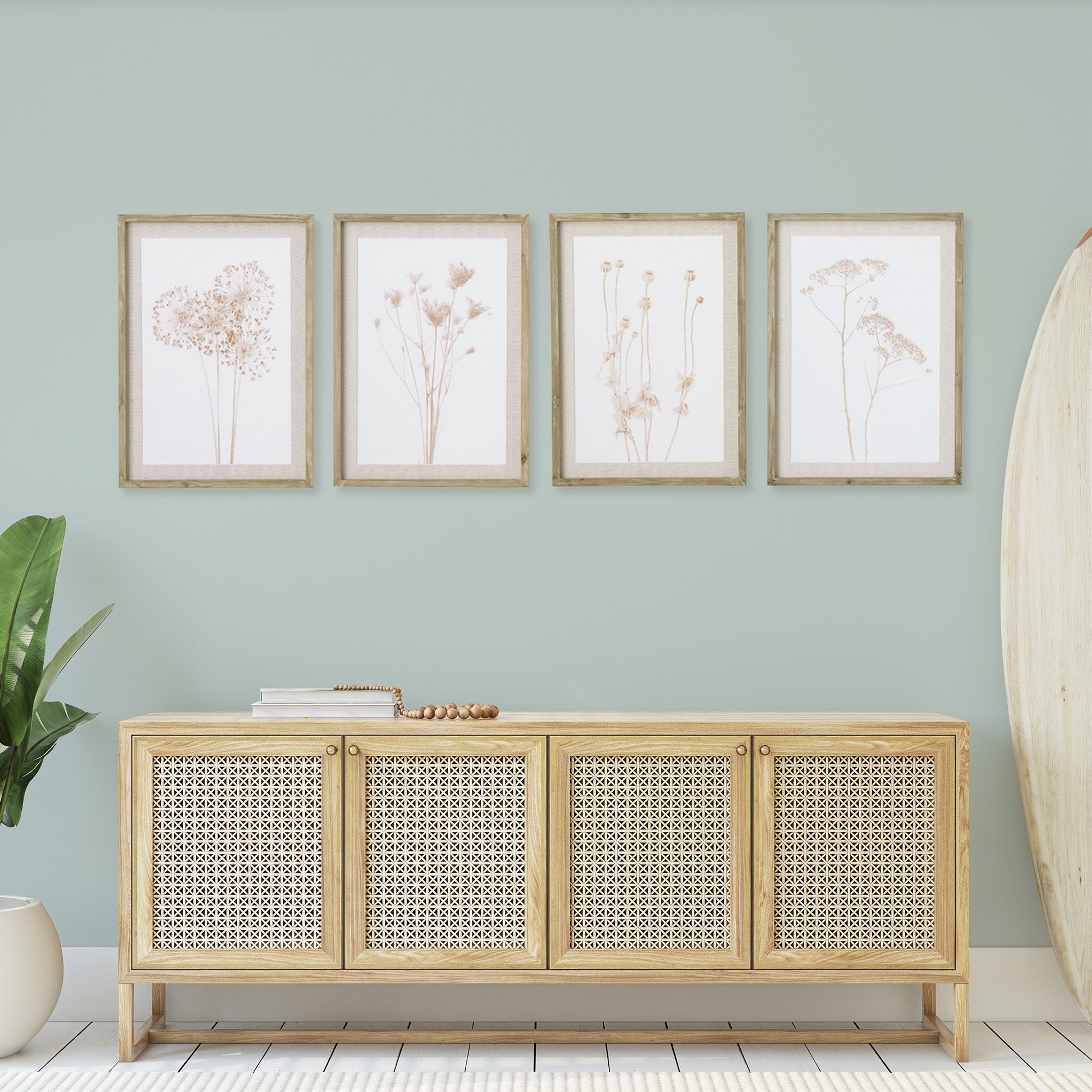 In a subtle sepia tone, this set of 4 assorted botanicals are light and airy. Finished off with a neutral mat and a natural pine wood frame, it makes a lovely accent for foyer, living room or bedroom.