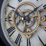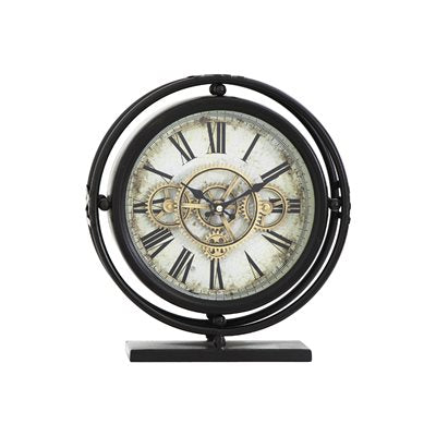 This table top clock features a functional gear mechanism with independently moving central gears visible on the antique-looking face. The clock displays time with hour and minute hands against bold Roman numerals.