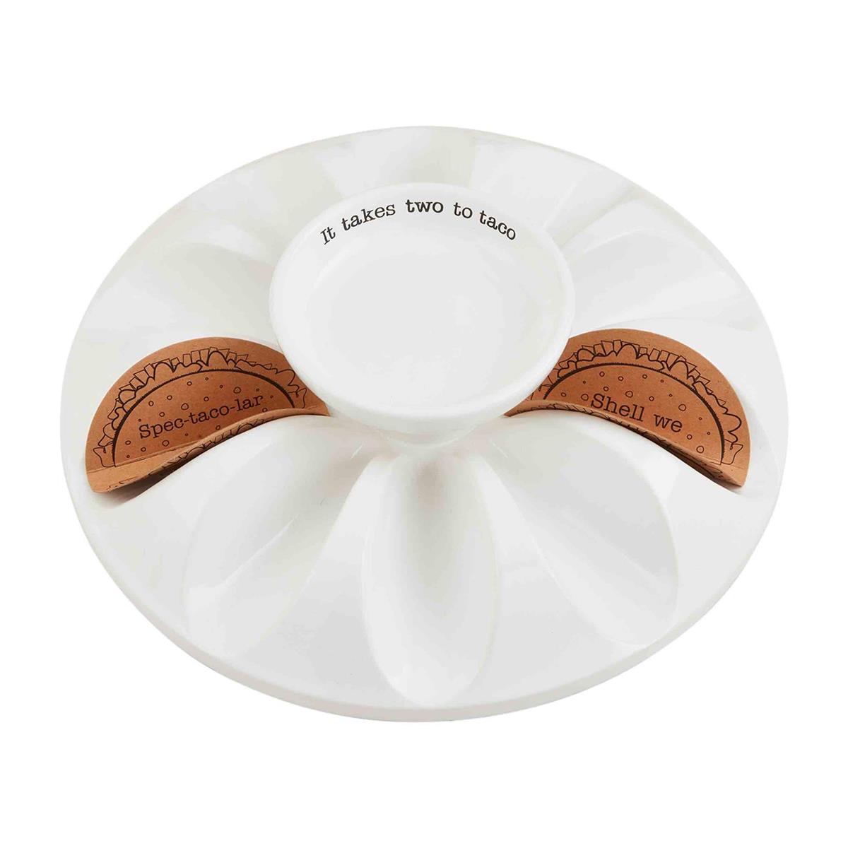 Description: Ceramic platter features dimensional grooves to hold taco shells upright and center dip bowl.