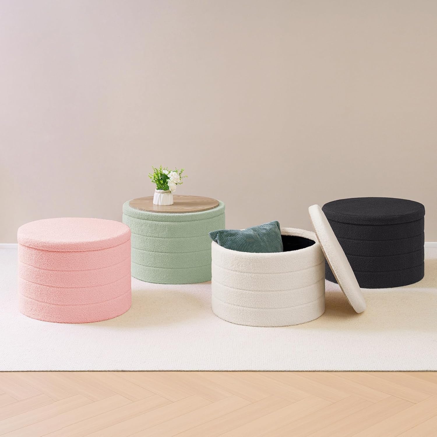 Elevate your space with a round white Sherpa boucle ottoman tray that blends plush comfort with practical storage. This 22-inch round ottoman works as a cozy foot rest and, with a simple lid flip, reveals a sturdy wooden tray—turning lounging into a lightweight, stylish coffee-table alternative.