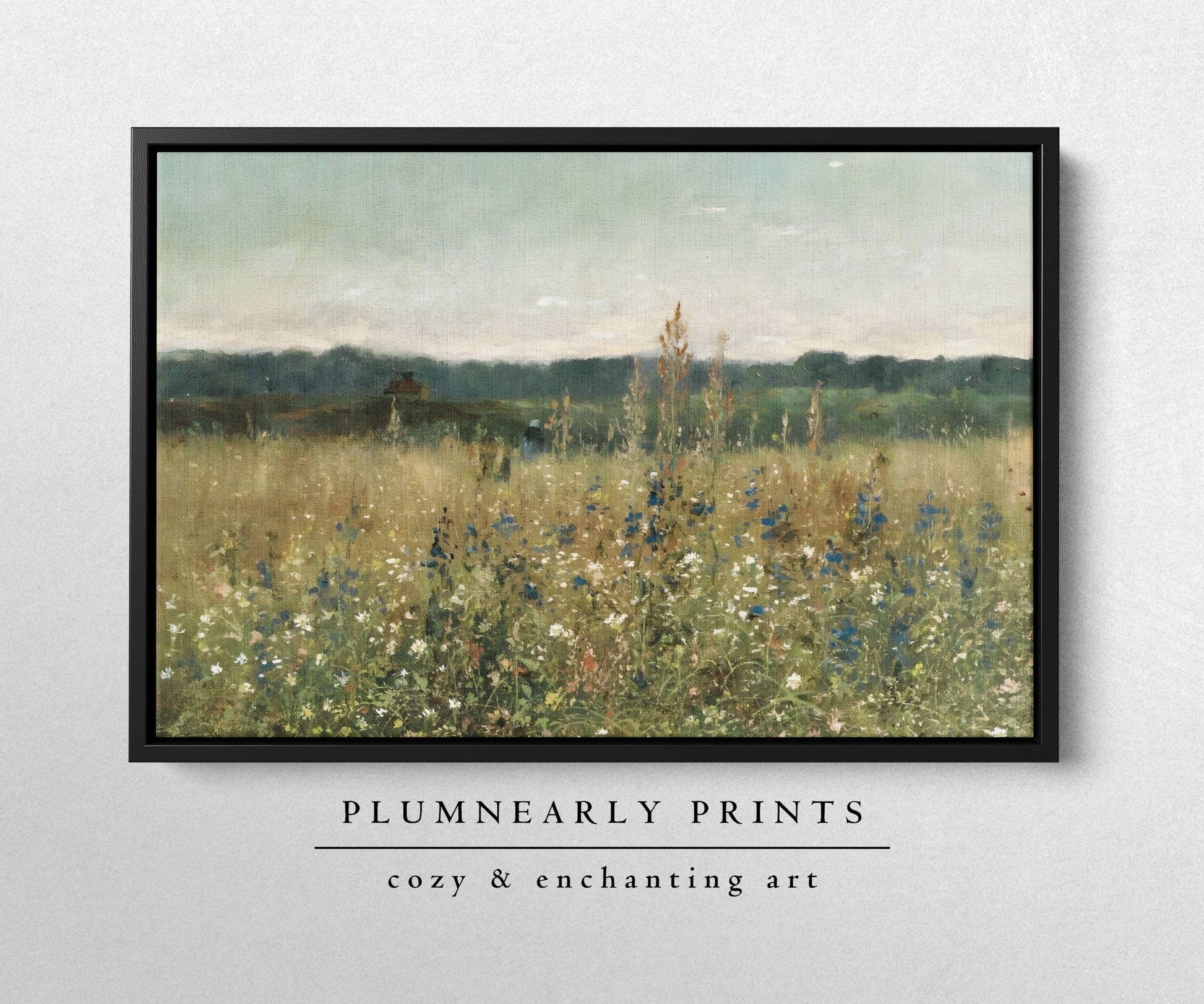 Wildflower Field Landscape Painting Framed Canvas Art 1: Walnut / 30 x 46 in