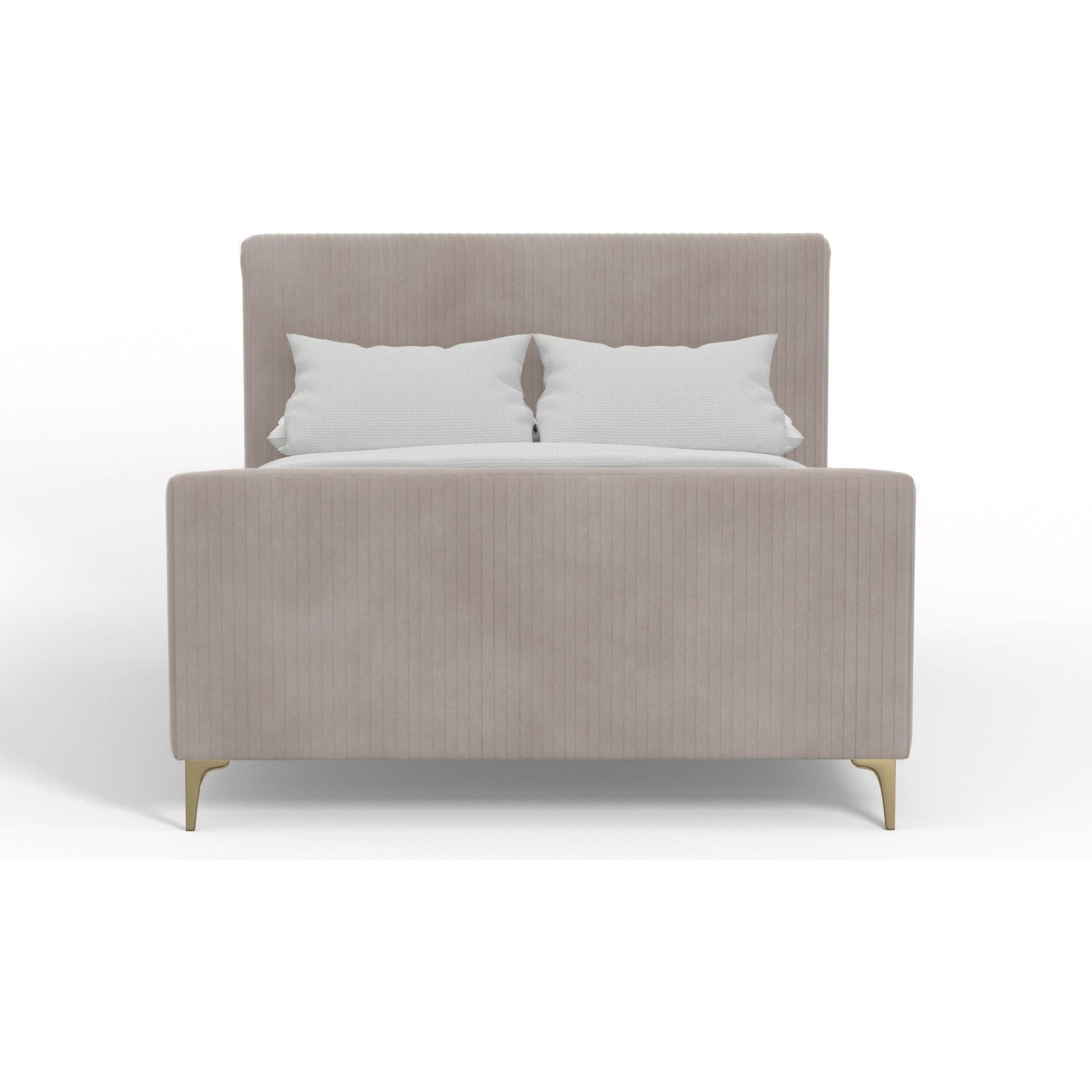 A great addition to any bedroom, the Zaldy Platform Bed is available in Queen, Cal King, Standard King, and Full size. The light grey fabric works with a variety of case pieces. Made from Velour Polyester, the ribbed treatment on the headboard and footboard is a stylish accent. Gold legs complete the piece. No box spring required.